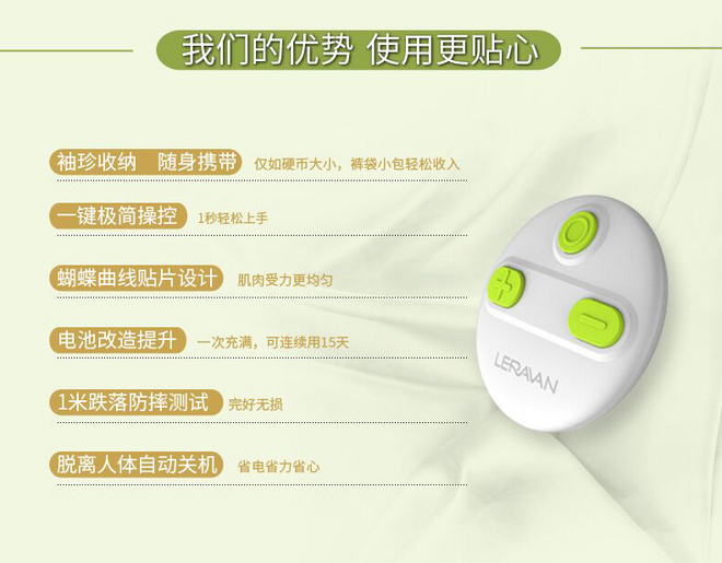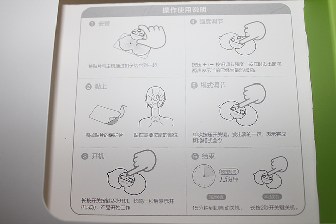 魔力贴总共有五种按摩模式,有十个档位的按摩强度,可以适合不同人群的需要。虽然魔力贴十分的小巧,但是力度却是十分的大,那些喜欢较大力度按摩的人也是能够满足的。贴上魔力贴,使用起来肌肉不停的抽搐,很好玩,对于缓解肌肉酸痛也是有一定的功效的,特别是对脖子酸痛或者是腰酸有很好的缓解,家里的人都使用过了,都对魔力贴赞不绝口。使用的时候,可以明显感觉到有电流通过,当魔力贴脱离人体时会自动断电,很贴心,在使用十五分钟后便会自动关机,魔力贴的设计还是挺人性化的。