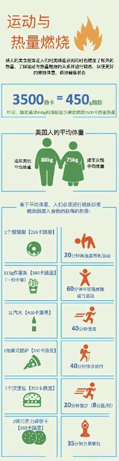 健康管理丨一图读懂运动与热量燃烧【营养发现】 时间:2015-12-26 甜甜圈、薯条、披萨······好想吃,怎么办?可是(⊙︿⊙)热量太高!没事!让多锐君带你,一图读懂运动与热量燃烧的关系!哼诱人的美食,健康的体重,再也不是艰难的二选一!