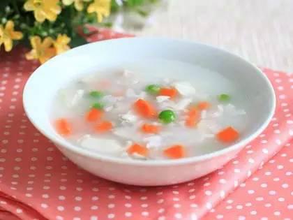 食材准备:龙利鱼柳50g、大米100g、胡萝卜丁适量、豌豆(煮熟)少许、食盐少许、黑芝麻油2滴。