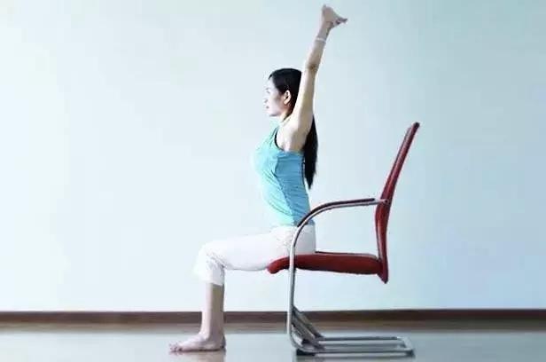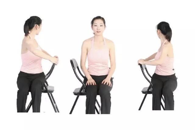(1)坐姿扭脊:坐于椅上,双腿自然自然地分开;双手抓住椅背并吸气,身体向左侧转动,两肘向两侧,眼睛往身后看;呼气并松开双手回到原位;双手抓住椅背并吸气,眼睛身体向右侧转动,两肘向两侧,眼睛往身后看;松开双手回到原位并呼气,重复5~10次。