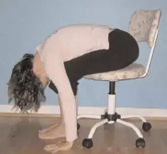 (2)坐姿体前屈:坐于椅上,身体前倾,使胸部、腹部贴向大腿,双手撑地,头部放松,保持30~60,可重复3~5次。