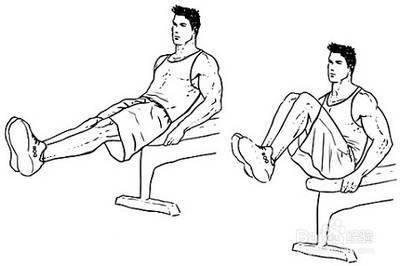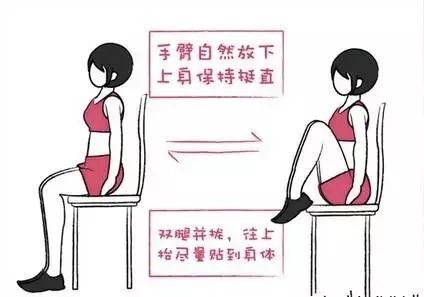 (1)坐姿收腿:坐于椅上,双手抓住练习椅子两侧固定身体,然后双脚腾空伸直,然后两脚屈膝向胸部靠拢,然后再慢慢还原到起始位置,每组15~20次,共3~5组,可有效锻炼腹部肌肉。