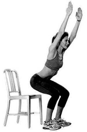 (1)蹲坐:双手放于膝上,坐正身体,挺直腰背,臀部抬起,离椅子5cm左右,保持姿势30~60秒,感受酸疼,重复2~4次,长期坚持可有效提高下肢耐力,塑造臀腿线条。