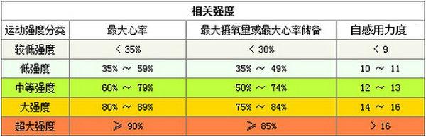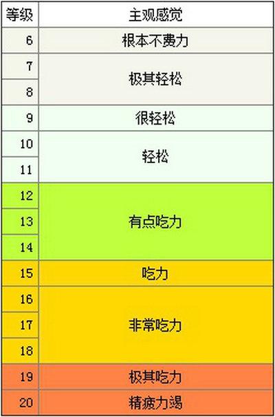 由瑞典生理学家冈奈尔•鲍格(Guenzel,Borg)制定的判断疲劳的自感用力度等级量表,将主观疲劳程度从6~20分为了15个分数级别,在年轻人群中,不同强度的RPE分值乘以10,大约相当于当时心率值(但这一规律在年龄较大的人群中推算不是很准确)。如RPE为12时,心率约为120次每分钟。中等运动强度应该控制在主观体力感觉量表的12~14(感觉有点吃力)之间。