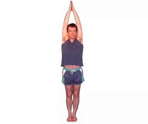 吸气时双手向上摆臂,让肱二头肌贴近双耳;呼气时放下双臂,贴在身体两侧。每组动作重复上下摆臂4次,注意力集中在深呼吸,并且尽量打开自己的胸腔。